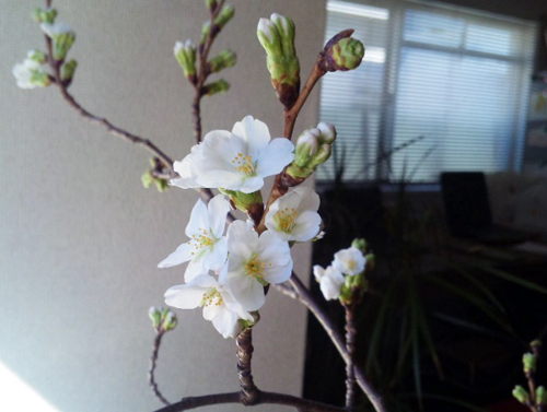 これは、拾ってきた桜の枝を、お家の中で水につけていたら、